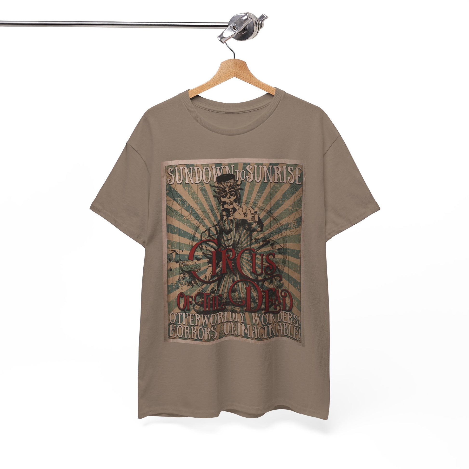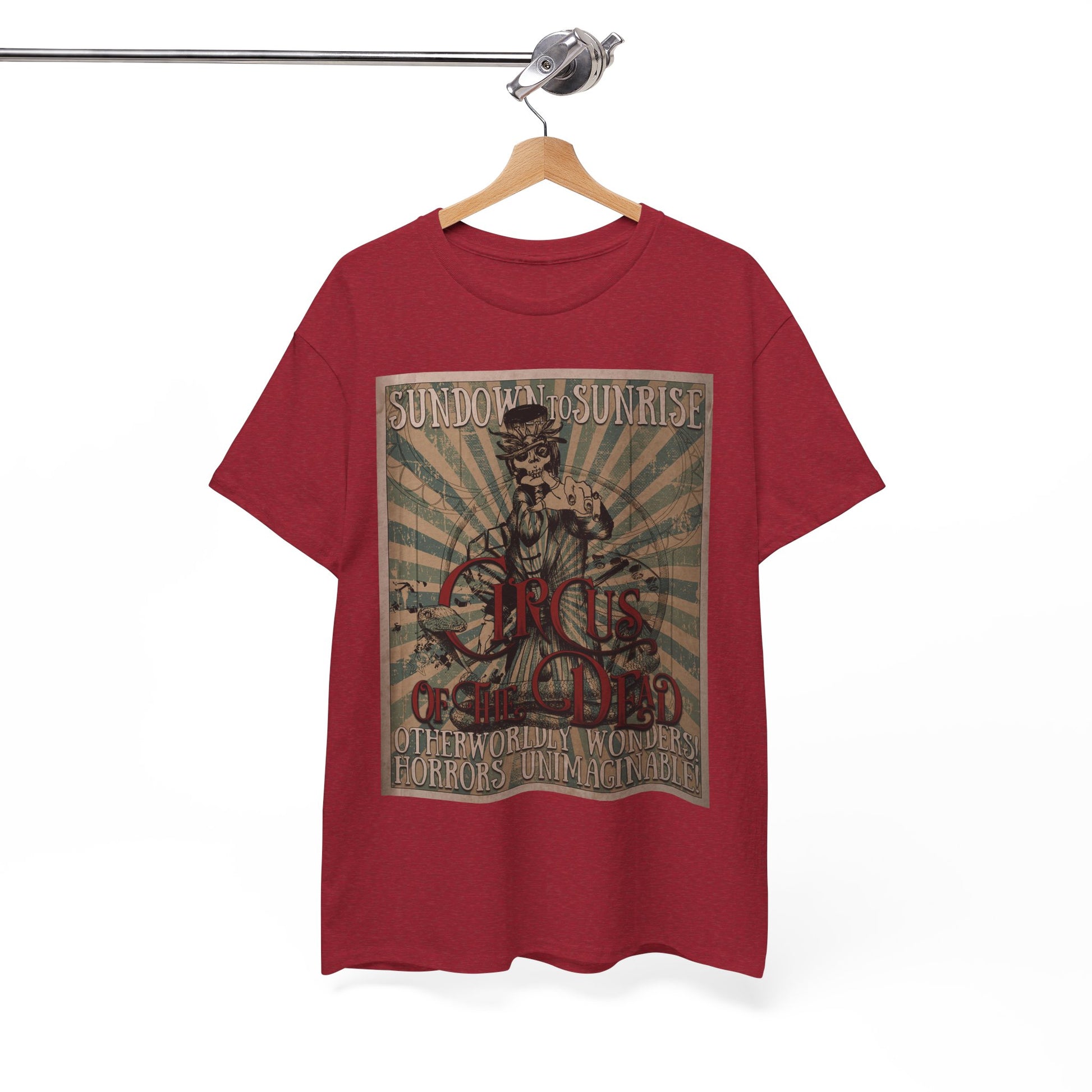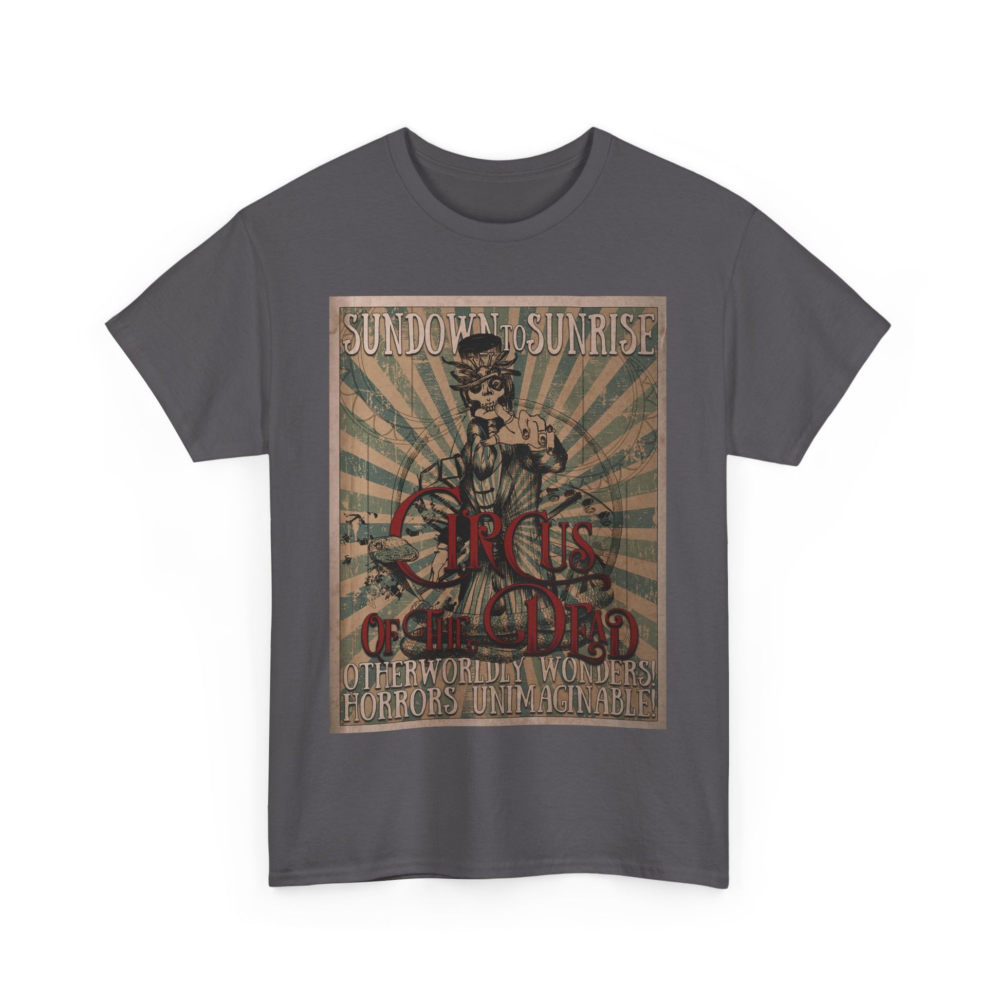 Prepare for your trip to the Circus of the Dead with this comfy T-shirt in multiple colors.